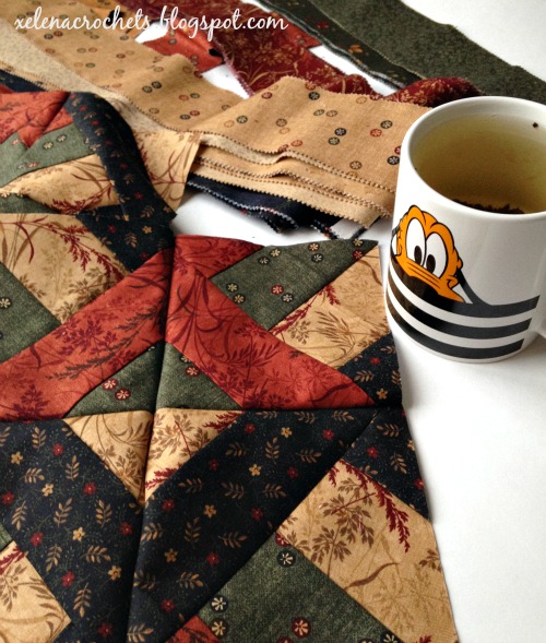 Я уже говорила, что шьется эта красота быстро и просто. Я за день сшила блоки, на второй день собрала все вместе. Как это делать я смотрела здесь. Вкратце - сшиваете вместе полоски, потом из них режете квадраты, высотой равные получившейся ширине сшитых полосок. Потом берете 2 квадрата, складываете лицом друг к другу, направив у одного полоски вертикально, у другого горизонтально. Сшиваете по периметру. Далее кладете на коврик и ножом режете накрест. Из получившихся треугольников собираете квадраты. И все!